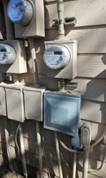 This meter (see photo below) is located in a small electrical box located on the southwest wall of the condos (behind the fence/gate). In addition, each dock has its own electrical panel. Ground Fault Circuit Interrupt protection is provided at each dock slip by individual GFCI outlets. The two street lights are powered from the bulkhead power through respective adjacent electrical panels.