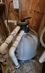 The large spherical filter requires back-washing as mandatory maintenance at regular intervals. The pool filter uses sand to filter the water. The filter is the large, roughly spherical tank on the west side of the pump house and it has a large valve on top of it. After storms and also during high pollen times in spring, the pool filter can become clogged between times when the pool maintenance service comes.